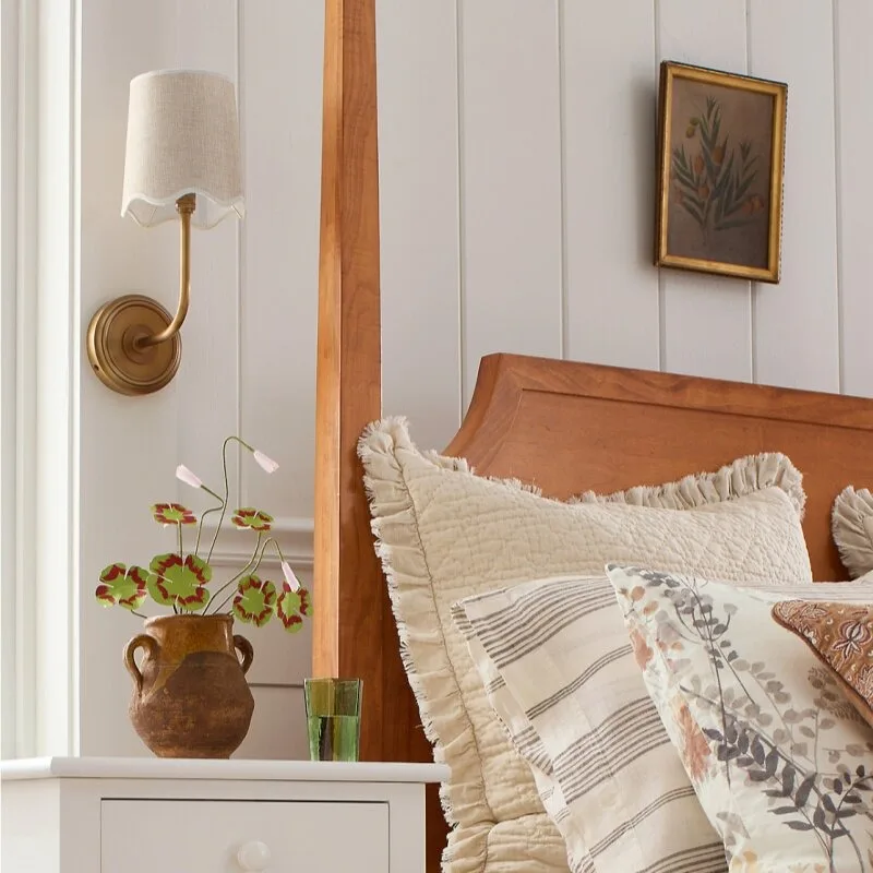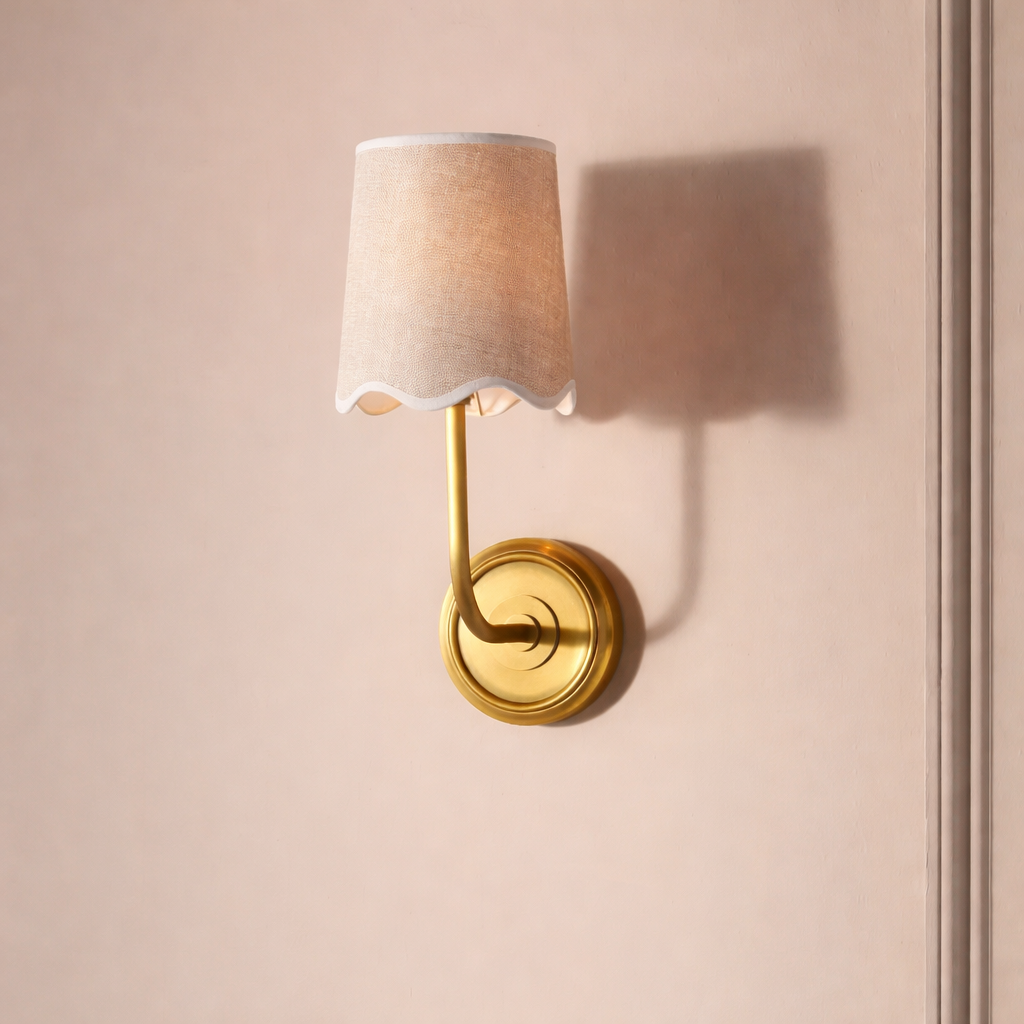 Soft and graceful, the Audrey Petite Wall Sconce brings a warm, intimate glow to your space. Its scalloped fabric shade and curved arm create a charming, vintage-inspired look. Perfect for cozy bedrooms and refined corners.