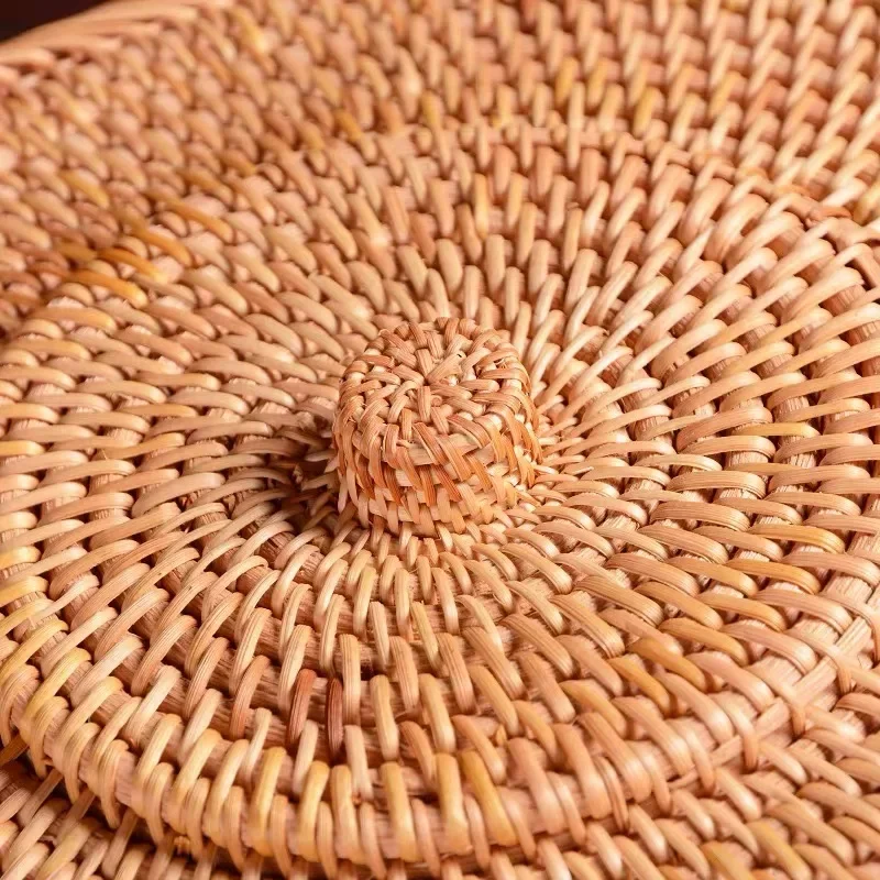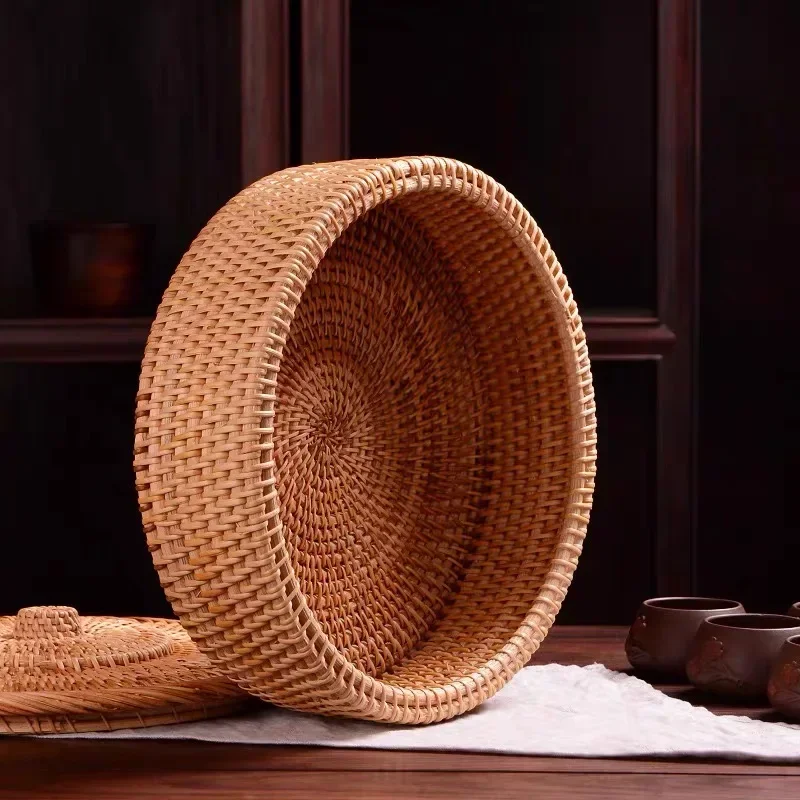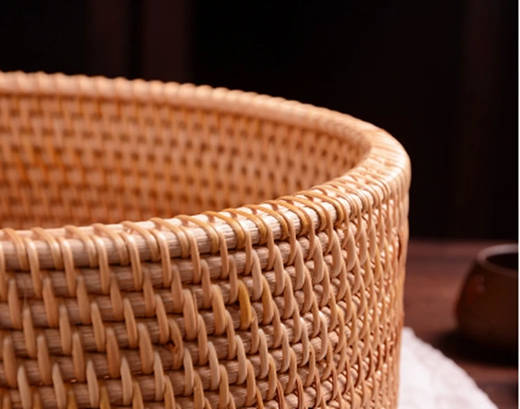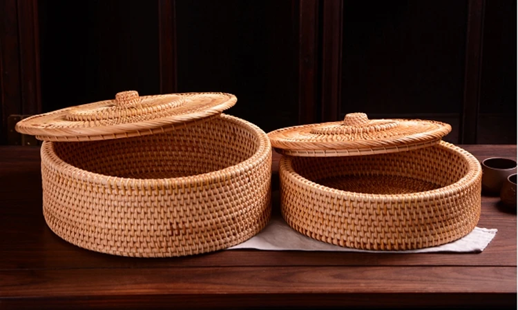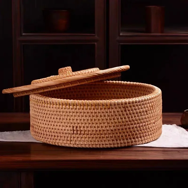 A simple retro-style rattan box in natural primary tones, handwoven with a lid for storing jewelry, tea sets, and small household items with timeless charm.